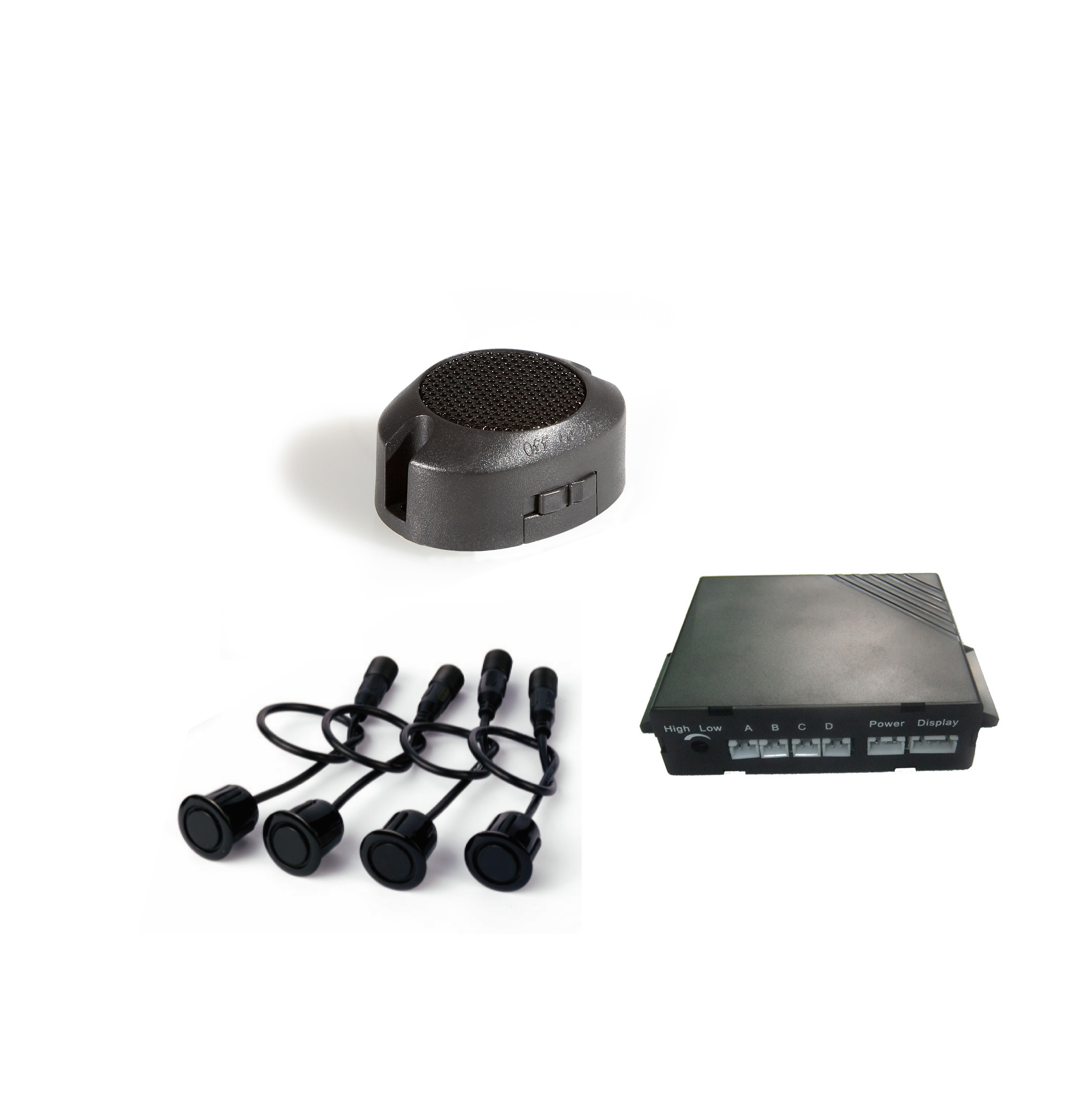 4 modules rear parking sensor set with hook/spare wheel masking system and sensitivity regulation. Set composed of 4 paintable sensors, control unit and buzzer. Wiring harness as well as drilling tool are included.