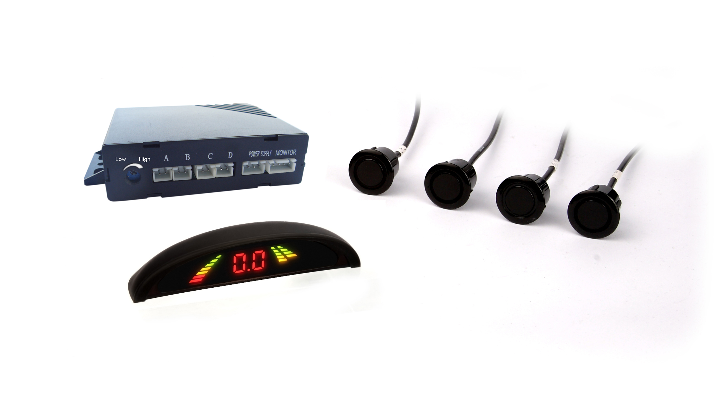 4 modules rear parking sensor set with hook/spare wheel masking system and sensitivity regulation. Set composed of 4 paintable sensors, control unit, color display and buzzer. Wiring harness as well as drilling tool are included.